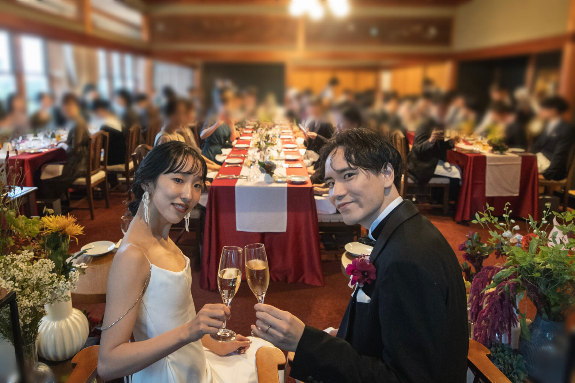 おふたりが選ばれたのは、時を重ねた本物の洋館。まるで物語の中に足を踏み入れたかのような世界観が広がり、「ここなら自分たちらしい表現ができる」と感じてくださったことが、決め手となりました。型にはまらず、オリジナリティを大切にしたいというおふたりの想いに自然と寄り添い、ゲスト一人ひとりと近い距離で感情を共有できることも魅力のひとつとなりました。世界観を何よりも大切にされる新婦様の感性と、丁寧に場を整える新郎様の想いが重なり合い、おふたりの舞台として選ばれました。